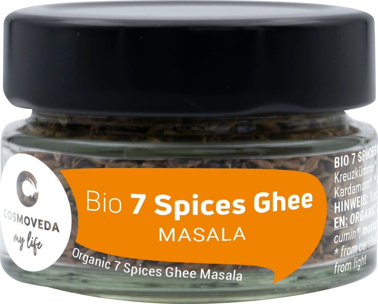 - 7 Spices Ghee Masala enthält Gewürze die Agni, das Verdauungsfeuer fördern.