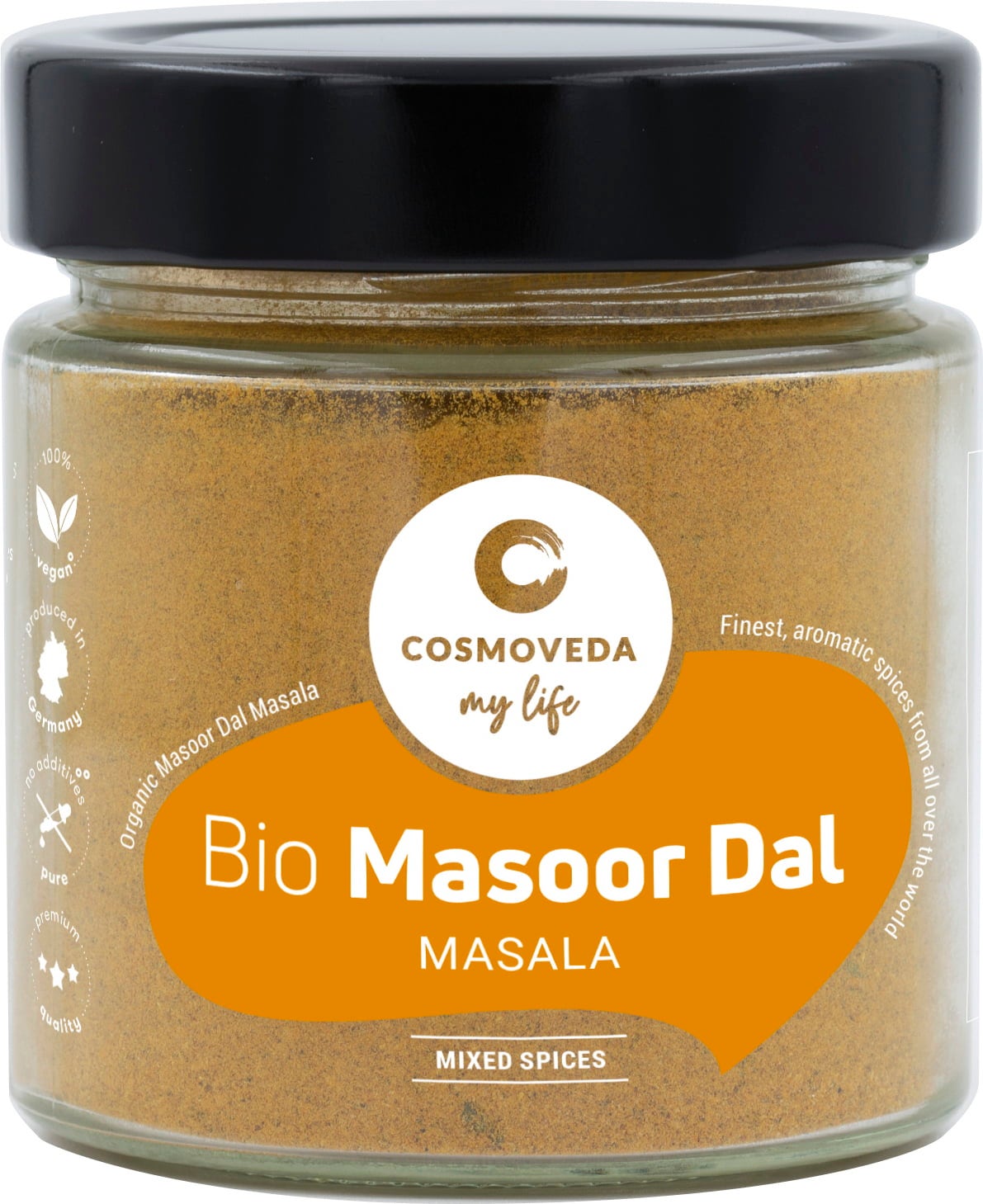 COSMOVEDA Bio Masoor Dal Masala ist eine speziell abgestimmte Gewürzmischung aus ayurvedischen Gewürzen, das köstliche Gerichte aus roten Linsen (Masoor Dal) gelingen lässt.