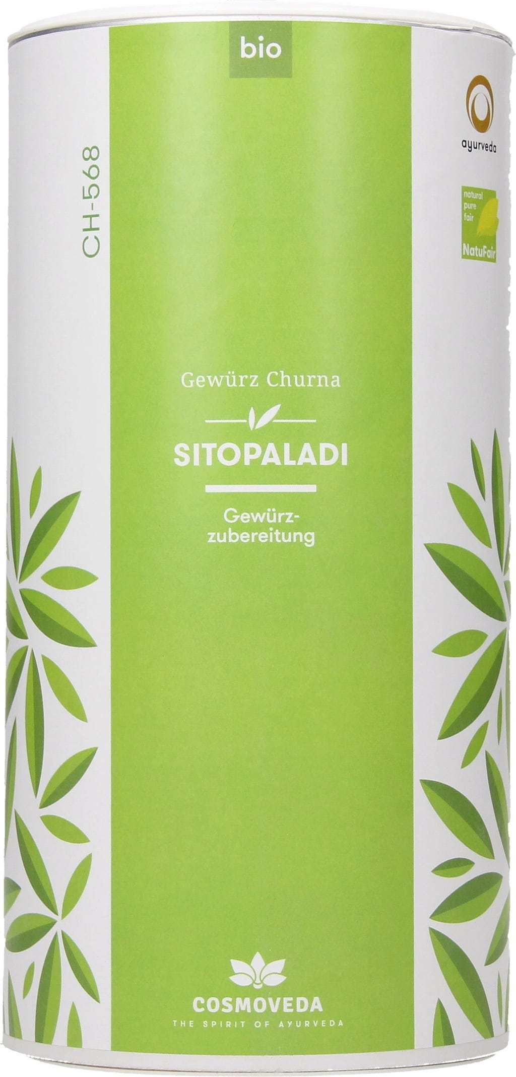 BIO Sitopaladi Churna von Cosmoveda beinhaltet eine ayurvedische Kräutermischung aus Pippali, Kardamom, Zimt, Vamsalochana und Rohrohrzucker in Bio Qualität.