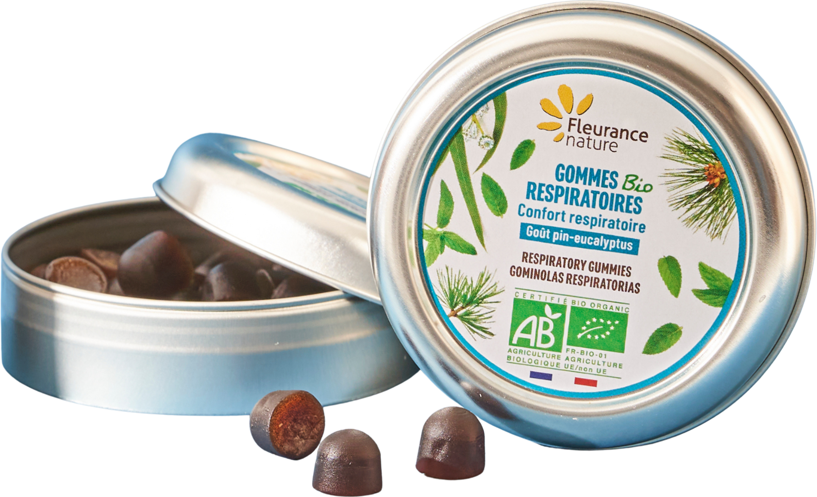 Die Gummis enthalten ätherische Öle aus Eukalyptus globulus, Pfefferminze und Waldkiefer, die BIO- und HEBBD-zertifiziert sind. Die Kombination aus ätherischen Ölen enthält Menthol, Eukalyptol und Alpha- sowie Beta-Pinen. Ihr frischer, holziger Geschmack sorgt für ein sofortiges und intensives Frischegefühl.