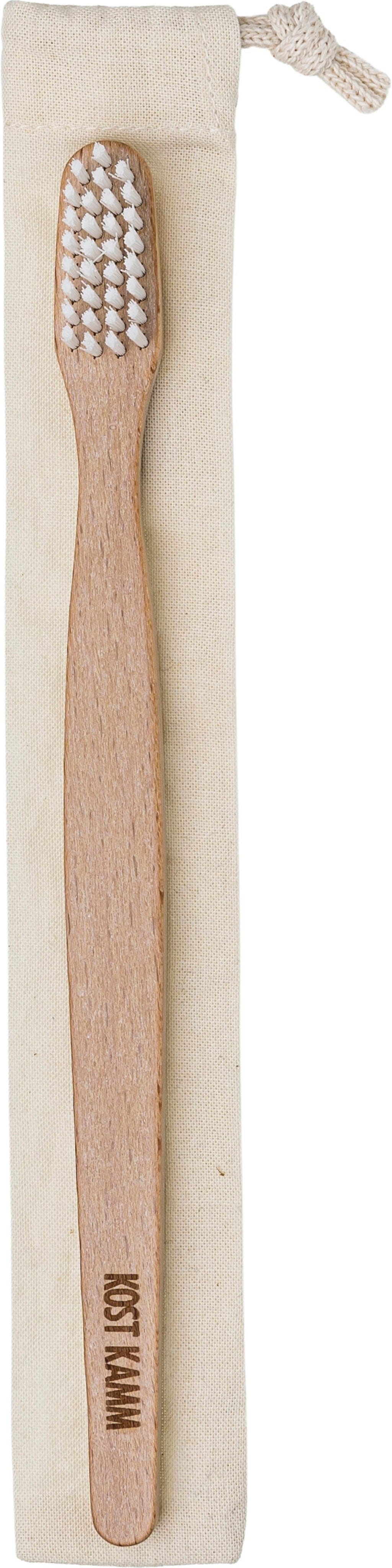 Die Zahnbürste überzeugt mit einem gewachsten Griff aus Buchenholz und veganen Kunststoffborsten.