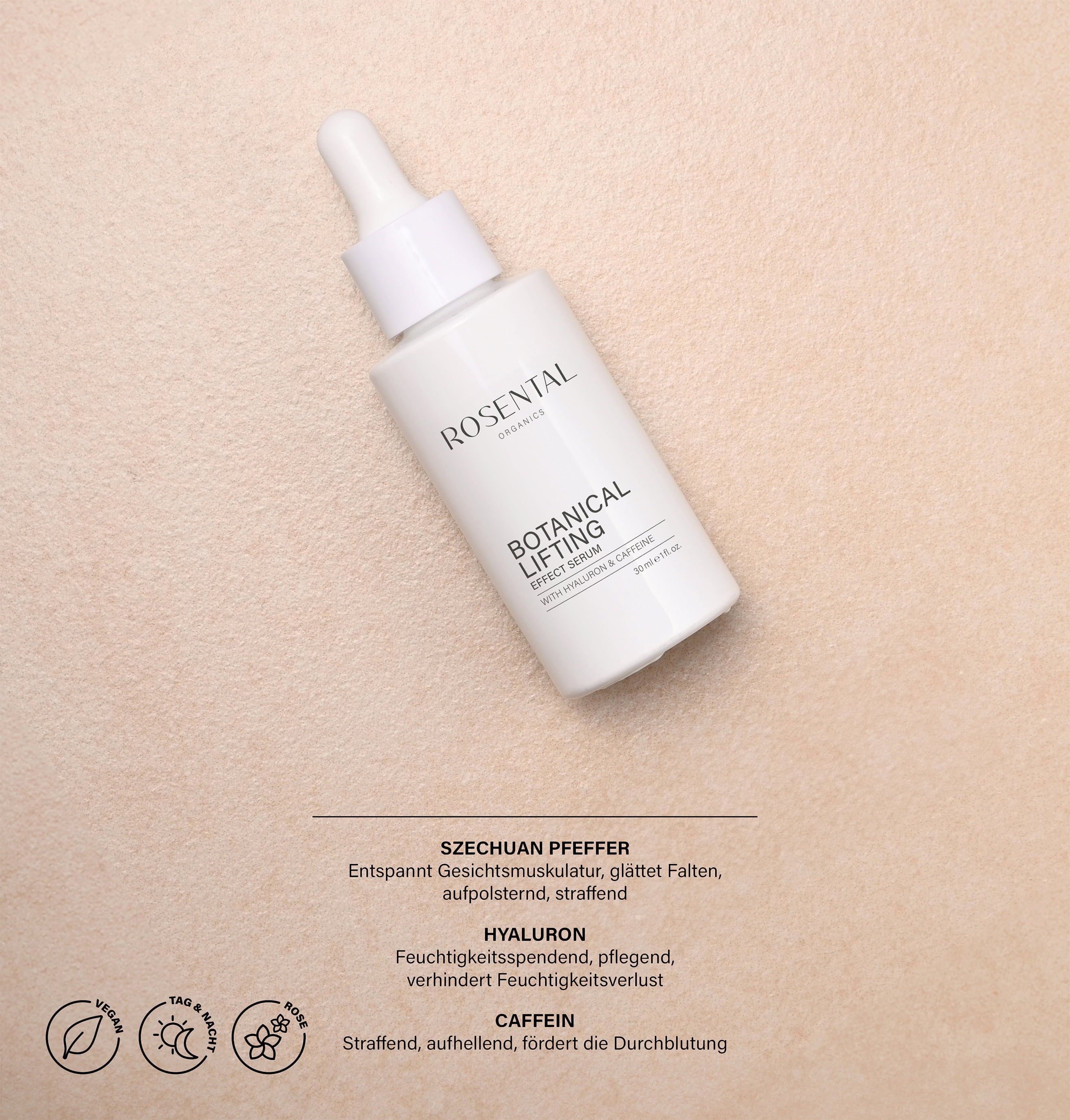 Das Botanical Lifting Effect Serum von Rosental Organics optimiert jede Pflegeroutine und setzt dabei auf hochwertige Pflanzenstoffe. Ein Zusammenspiel aus Hyaluronsäure und Koffein glättet feine Linie, hellt Hautpartien auf und spendet Feuchtigkeit, während Szechuan Pfeffer die Gesichtsmuskulatur auflockert und dabei die Haut straffer erscheinen lässt.