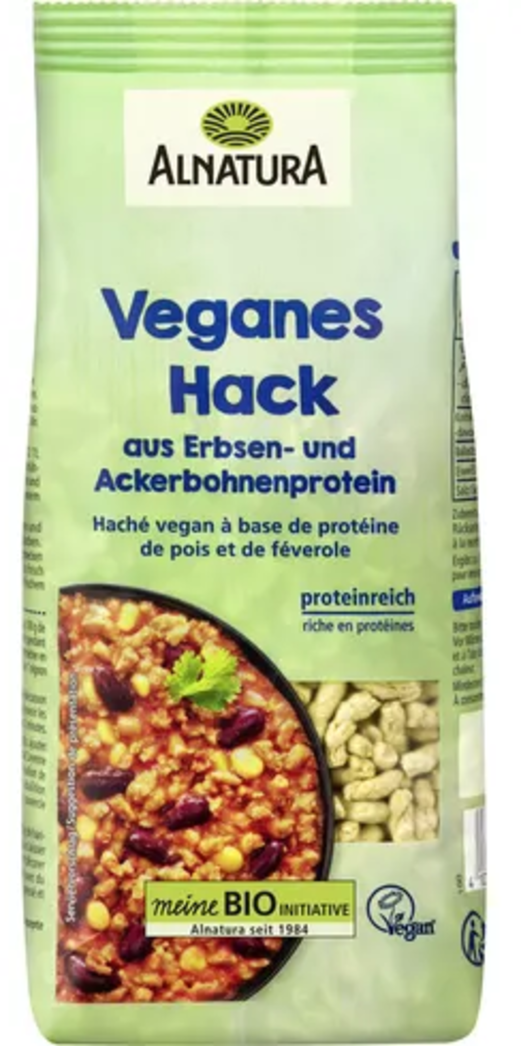 Het vegan biologische gehakt van Alnatura is sojavrij omdat het gemaakt wordt van erwten en tuinbonen. Het is daardoor van nature rijk aan eiwitten en leent zich uitstekend als vleesvervanger voor Bolognesesaus, chili sin carne of moussaka.