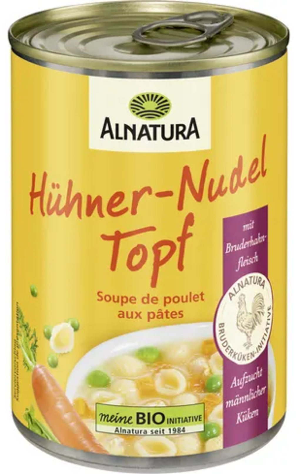 De biologische kip-noedel-stoofpot van Alnatura is op smaak gebracht met groenten en aromatische peterselie en kurkuma. Het is ideaal om snel te bereiden, omdat het alleen opgewarmd hoeft te worden - koken is niet nodig.