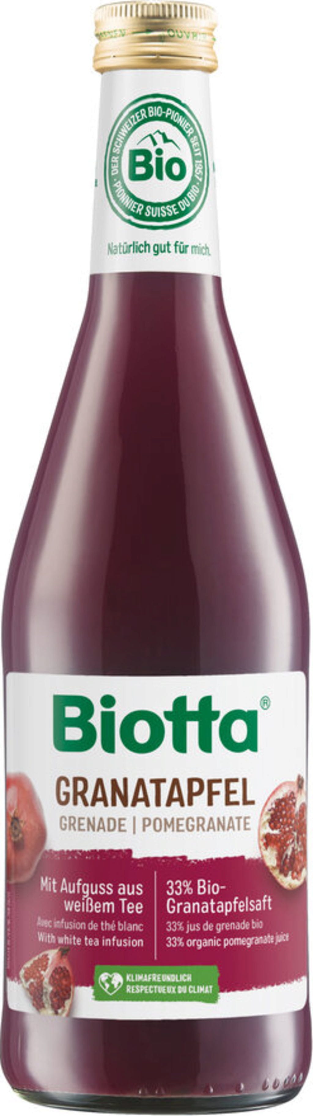 Ervaar de rode vrucht in zijn pure vorm: Biotta granaatappelsap bevat 33% biologisch granaatappelsap, aangevuld met andere zorgvuldig geselecteerde directe sappen. De granaatappels zijn afkomstig uit gecontroleerde biologische teelt in Turkije, waar ze onder optimale omstandigheden rijpen. Dankzij de voorzichtige verwerking blijven de natuurlijke eigenschappen van de vrucht behouden.