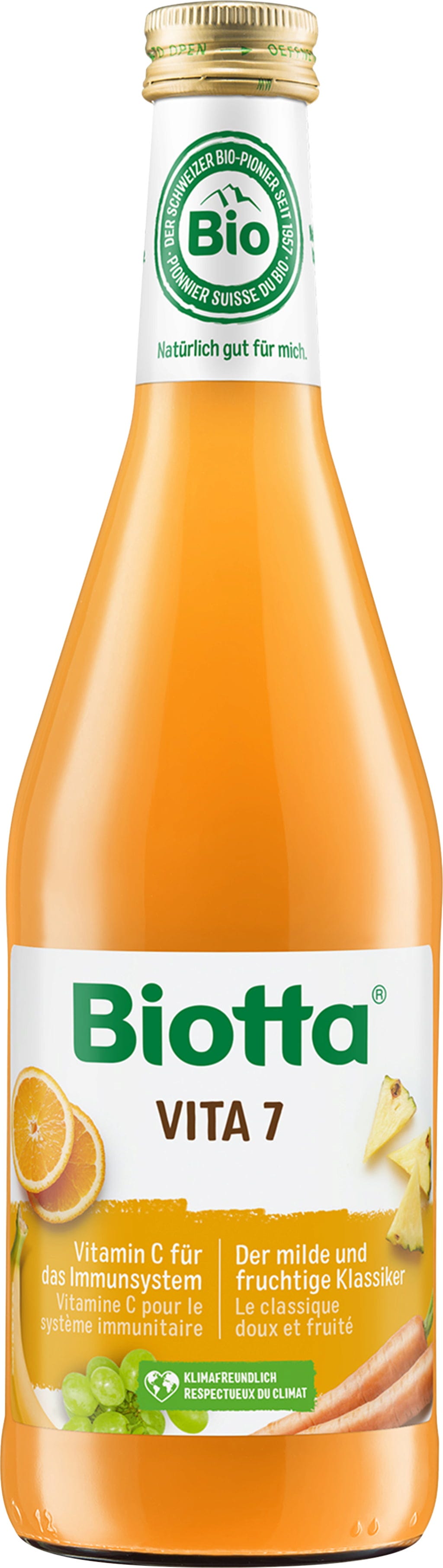 Biotta Vita 7 is een harmonieuze mix van 7 versgeperste sappen gemaakt van fruit en groenten. Het sap is een heerlijke combinatie van verschillende directe sappen met vitamine C en zonder kunstmatige toevoegingen.