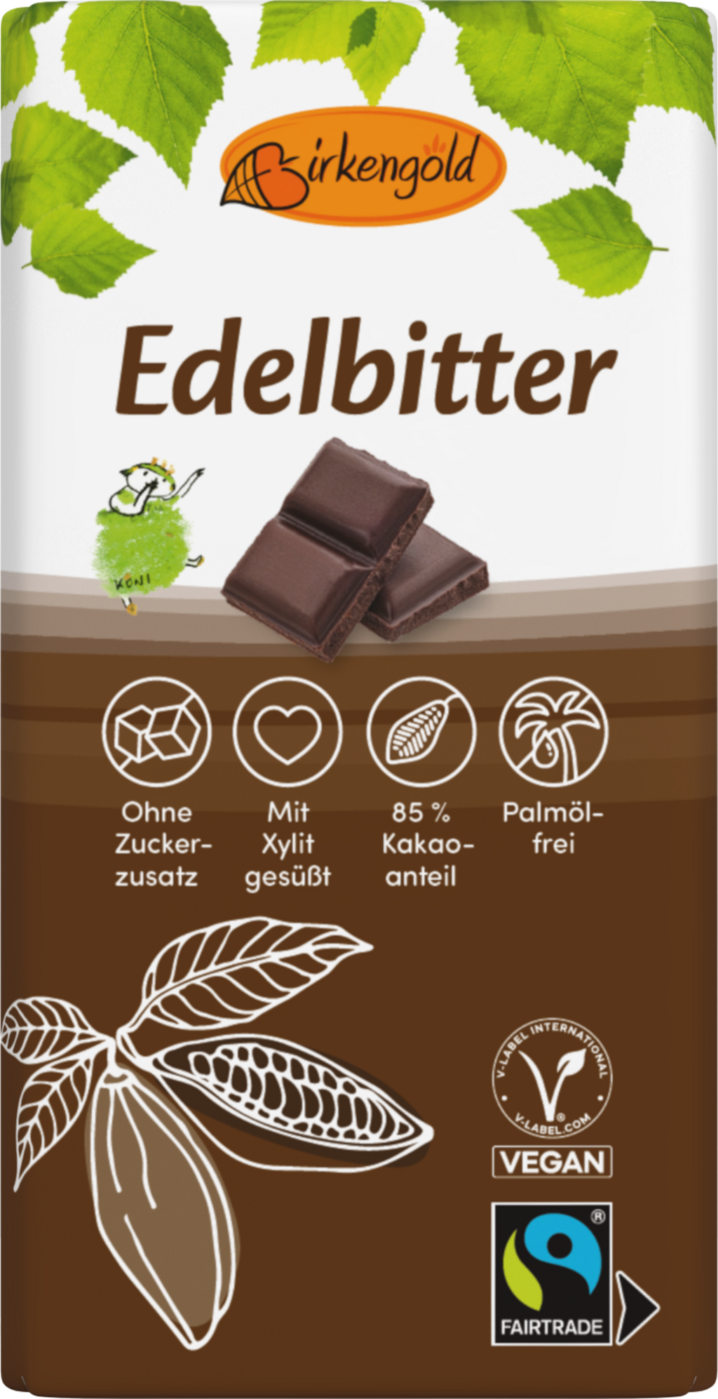 Deze donkere chocoladereep met een cacaogehalte van 85% is gezoet met Birkengold® xylitol om een speciale traktatie te creëren, of het nu als tussendoortje is of als gezond cadeau voor geliefden. Het is vrij van toegevoegde suikers en gezoet met xylitol, een natuurlijke zoetstof die wordt gewonnen uit de bast van berken- en beukenbomen. De cacao draagt het Fairtrade-zegel en is afkomstig uit Ecuador of Ivoorkust.