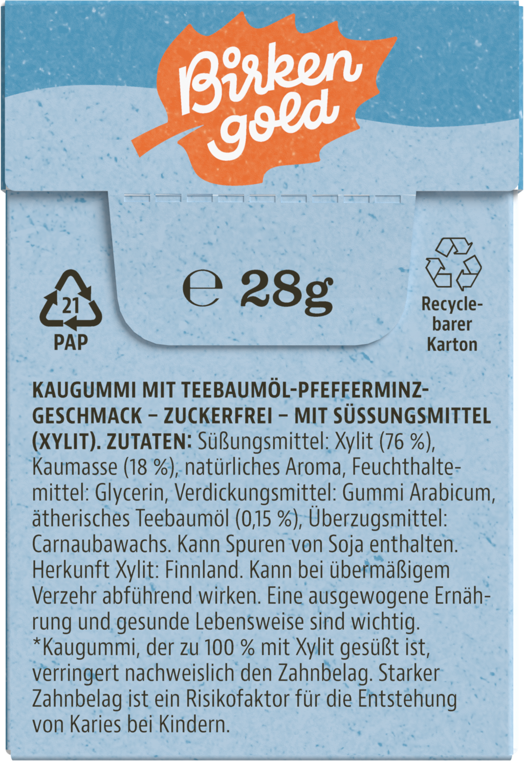 Birkengold Xylit kauwgom Tea Tree–Mint, 28 g