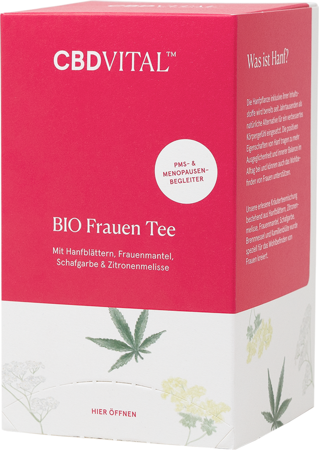 De biologische vrouwenthee van CBD Vital is een zachte kruidenthee met hennepbladeren. Het recept bevat ook vrouwenmantel, citroenmelisse, duizendblad, brandnetel, kamillebloemen, passiebloemen, rozenblaadjes en goudsbloemen. De thee is vrij van smaakstoffen en additieven. Zakjes en theezakjes zijn biologisch afbreekbaar.
