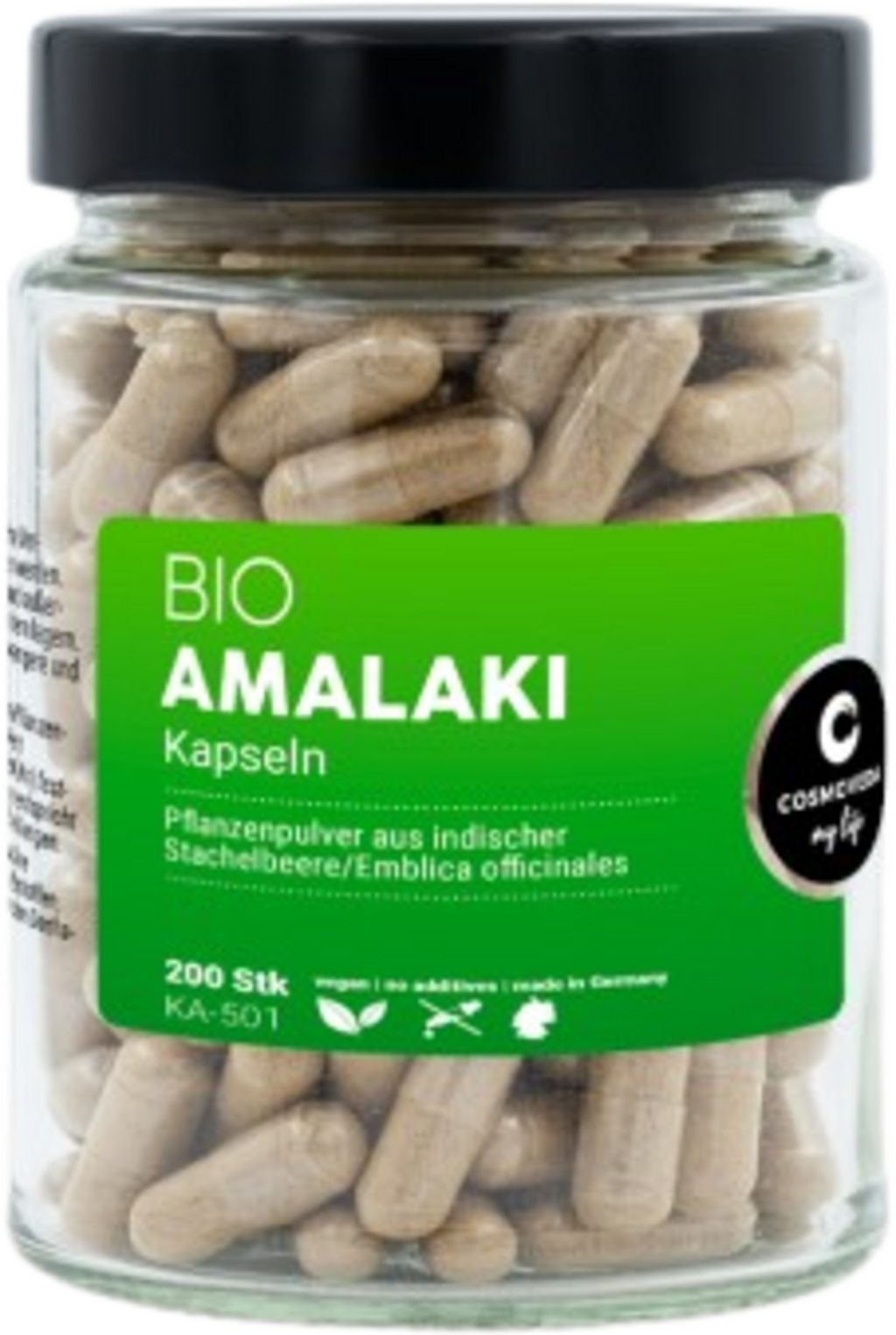 Amalaki syn. Amla - Phyllantus emblica - is een zeer aantrekkelijke, middelgrote bladverliezende boom met geveerde bladeren, lichtgroene bloemen en afgeronde lichtgroene tot gele vruchten. De vruchten worden gebruikt in de Ayurvedische voeding. Het poeder van de vruchten, dat in onze eigen productie fijn en voorzichtig wordt gemalen (onder de 40 °C), is afkomstig van Indiase en Sri Lankaanse fairtrade- en biologische projecten van Cosmoveda.