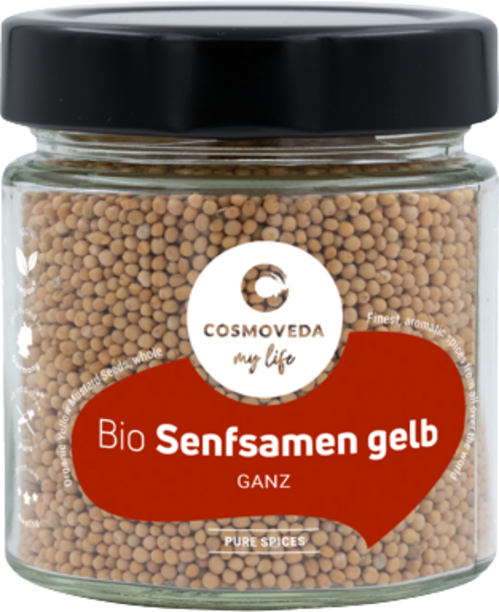 De gele mosterdzaadjes van Cosmoveda geven ingelegde groenten, augurken en kerriemengsels een pittig, licht nootachtig tintje.