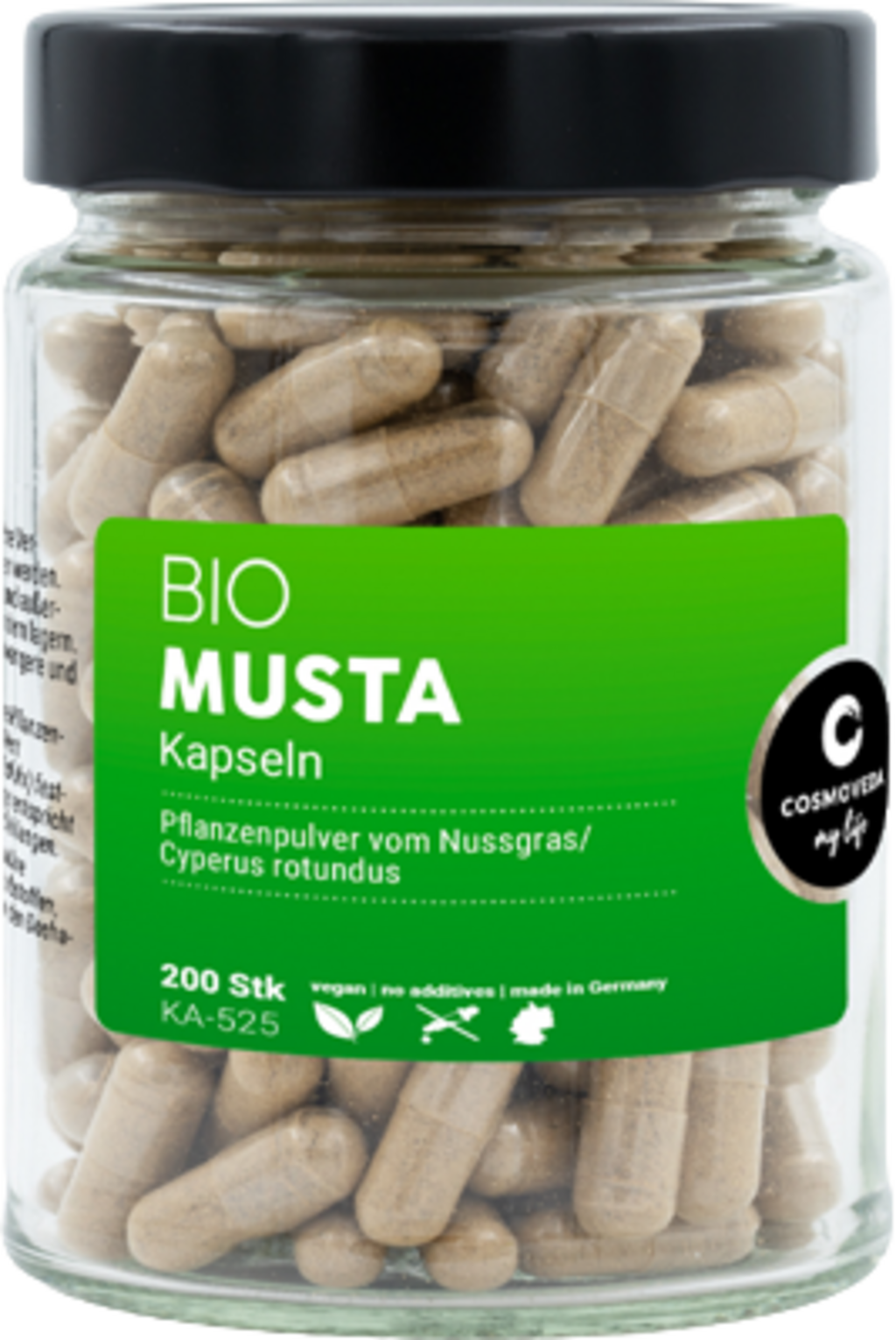 Musta - Cyperus rotundus - is een meerjarige zegge van 30-40 cm hoog met een driehoekige stengel, 4-7 mm brede bladeren en een bolvormige wortelstok, gebruikt in de Ayurvedische voeding.