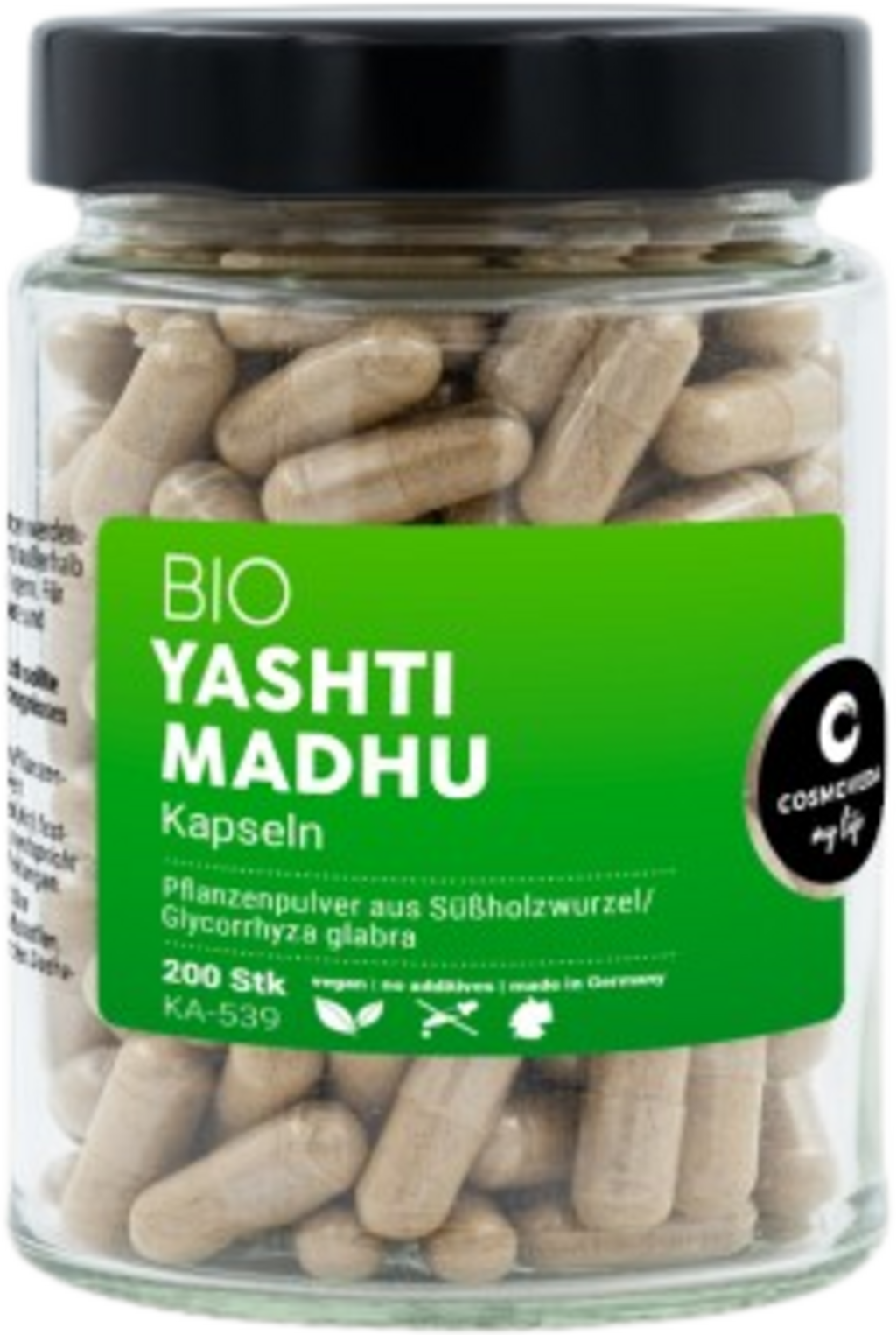 Yashtimadhu, ook bekend als zoethout, is vaste plant kan tot 2 meter hoog worden. Cosmoveda gebruikt alleen de wortel voor de Bio Yashtimadhu Capsules.