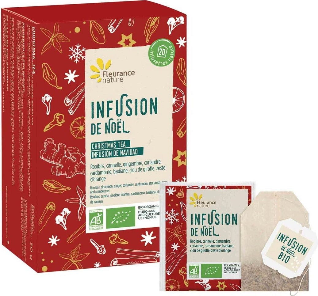 De kerstthee van Fleurance nature vangt de magie van Kerstmis. Het is verrijkt met rooibos, kaneel, kruidnagel, gember, koriander, zoethout, zwarte peper en steranijs die zorgen voor een aangename, warme smaak.