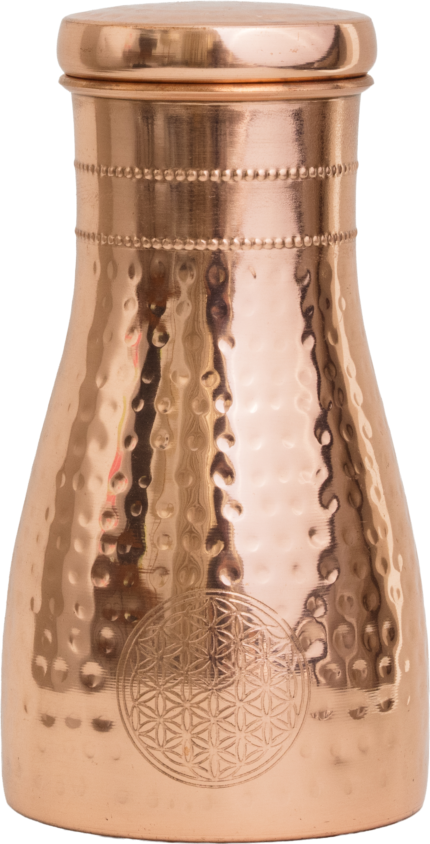 Deze gehamerde koperen kan met het motief van de Levensbloem is ontworpen om van elk glas water een moment van aandacht en bewustzijn te maken.
