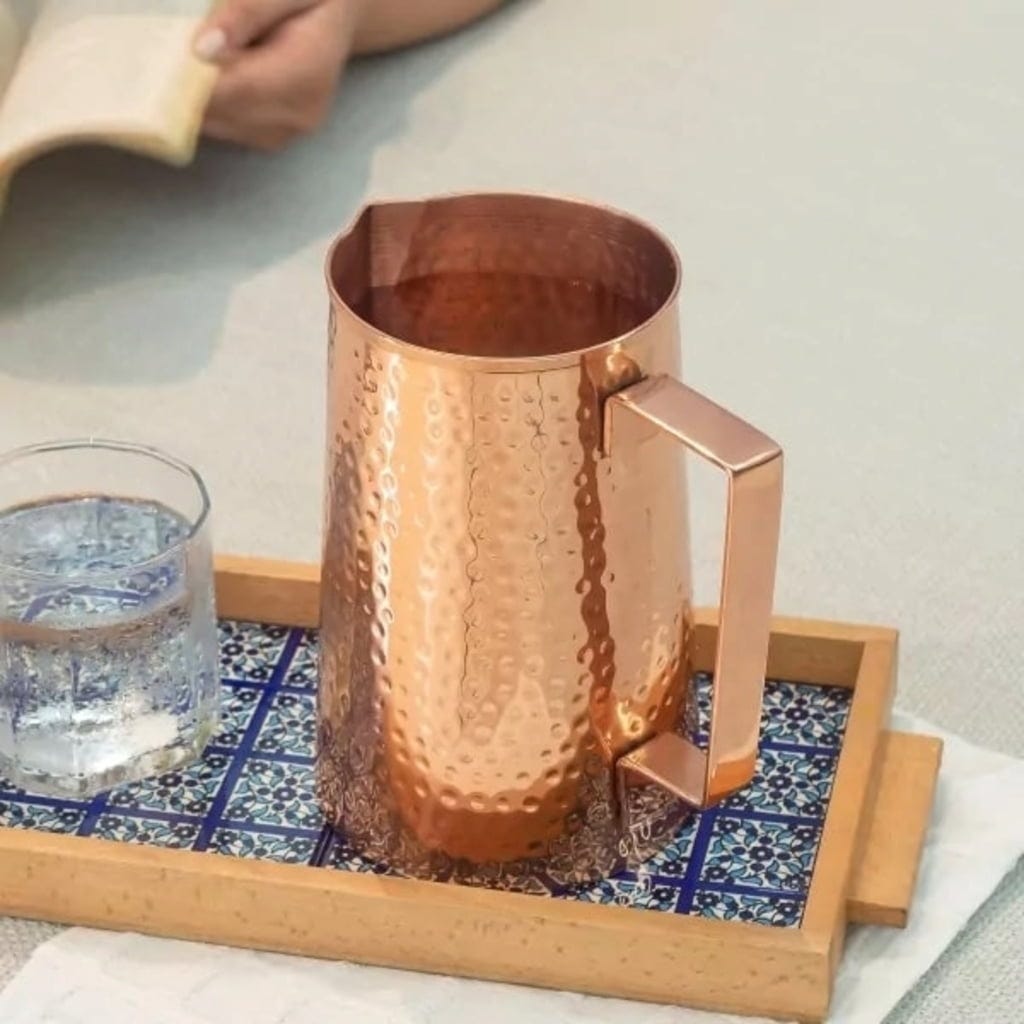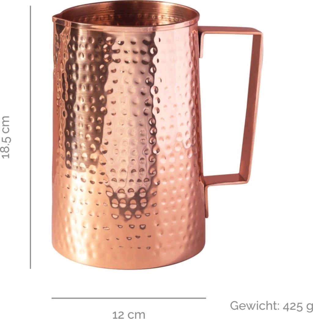 Deze koperen kan is ideaal voor het serveren van stilstaand water of kan als alternatief worden omgebouwd tot een stijlvolle bloemenvaas. De kan van voedselveilig koper is liefdevol met de hand gemaakt in India en combineert zo modern design met traditioneel handwerk. Aan de buitenkant gecoat met een voedselveilige lak en aan de binnenkant natuurlijk gelaten, levert de kan natuurlijk alkalisch water.