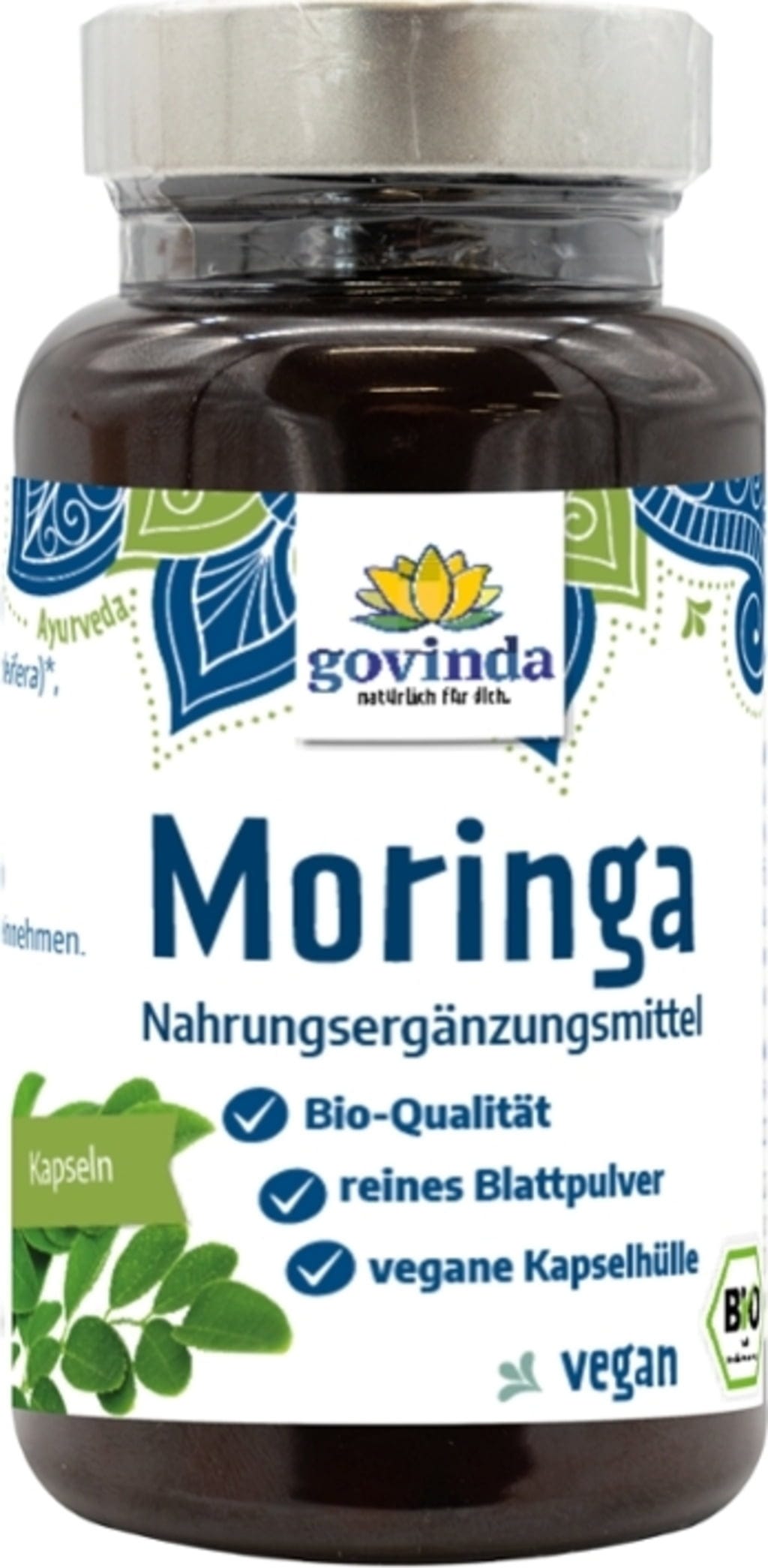 De biologische Moringa capsules van Govinda zijn 100% veganistisch, glutenvrij en lactosevrij. Ze zijn ideaal als supplement voor mensen met een overheersende Vata of Kapha dosha en kunnen dagelijks worden ingenomen.