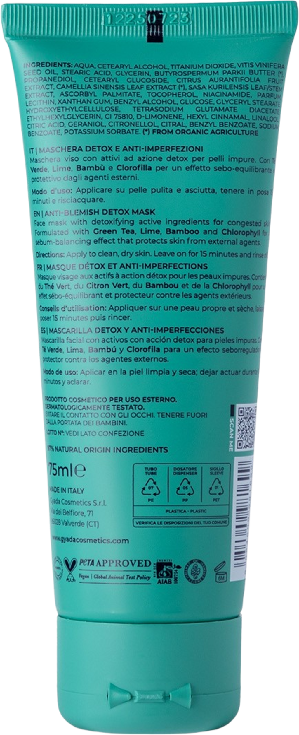 Het detoxmasker van GYADA Cosmetics verwijdert onzuiverheden en verbetert zichtbaar de teint. Het is ideaal voor een onzuivere en vette huid die ook wordt gestrest door externe invloeden van smog. De belangrijkste ingrediënten groene thee, limoen en bamboe water reinigen de huid tot diep in de poriën, hebben een samentrekkende en antioxiderende werking. De formule bevat ook niacinamide (vitamine B3), dat de talgproductie reguleert, chlorofyl als natuurlijke antioxidant en druivenpitolie, dat de huid beschermt tegen vrije radicalen.