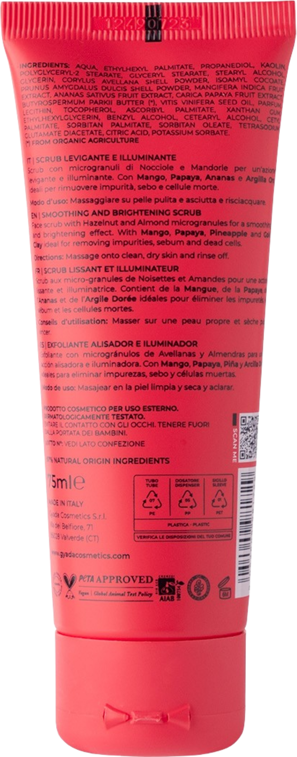 Aqua, Ethylhexyl Palmitate, Propandiol, Caolin Clay, Polyglyceryl-2 Stearate, Glyceryl Stearate Se, Stearyl Alcohol, Glycerin, Corylus Avellana Shell Powder, Isoamyl Cocoate, Prunus Amygdalus Dulcis (Sweet Almond) Shell Powder, Mangifera Indica Fruit Extract, Ananas Sativus Fruit Extrat, Carica Papaya (Papaya) Fruit Extract, Butyrospermum Parkii (Shea) Butter[1], Vitis Vinifera Seed Oil, Parfum (Fragrance), Lecithin, Tocopherol (Vitamin E), Ascorbyl Palmitate (Vitamin C), Xanthan Gum, Ethylhexylglycerin, Benzyl Alcohol, Cetearylalcohol, Cetyl Palmitate, Sorbitan Palmitate, Sorbitan Oleate, Tetrasodium Glutamate Diacetate, Citricacid