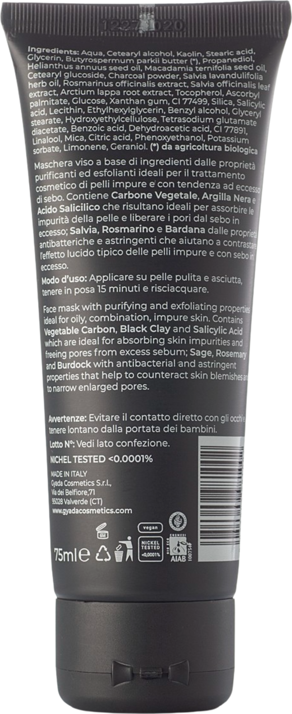 Dit masker is ideaal voor een onzuivere huid en een vette huid. Geactiveerde houtskool, zwarte klei en salicylzuur werken verhelderend, verwijderen onzuiverheden en maken de poriën vrij van overtollig talg. De toevoeging van rozemarijn, salie en klis heeft ook een samentrekkend en matterend effect op de vette huid.