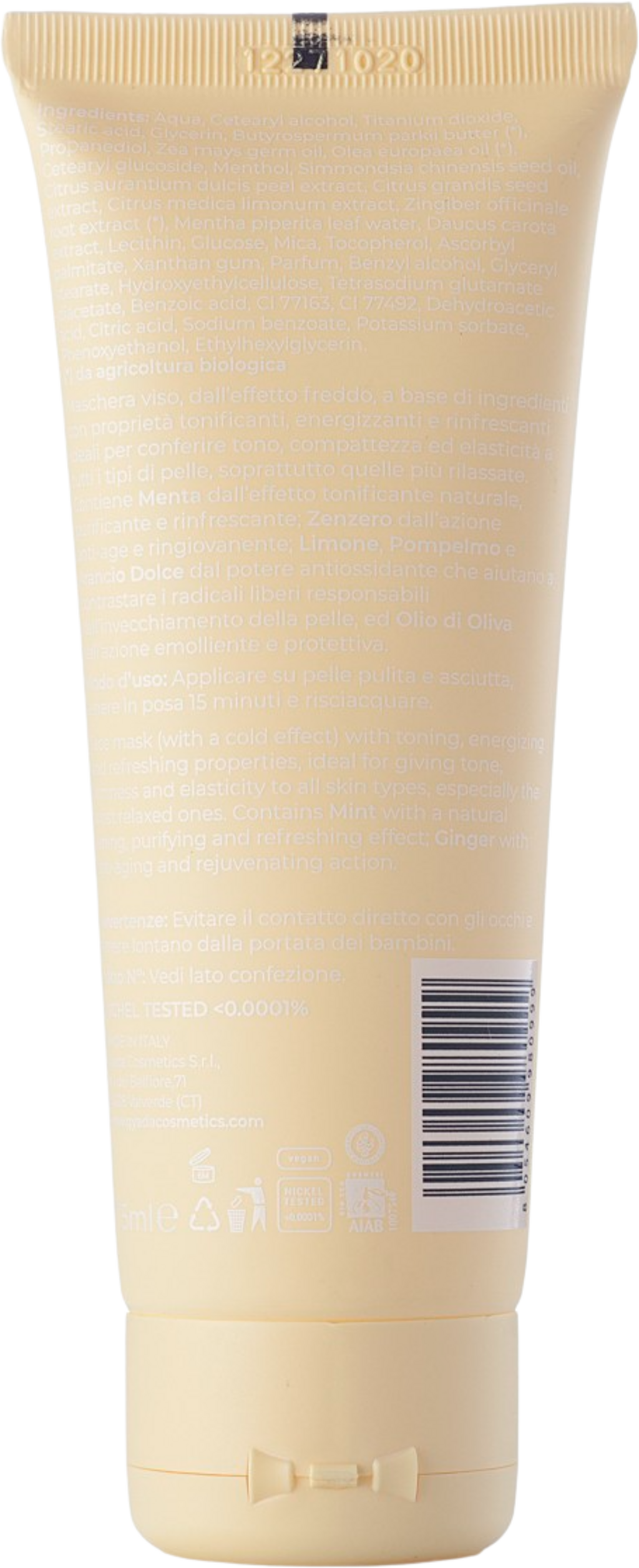 Dit verkoelende gezichtsmasker verstevigt de huid met natuurlijke plantaardige ingrediënten. Het geeft de huid frisheid en nieuwe energie - vooral een bleke huid, het geeft meer veerkracht, elasticiteit en een egale teint. Het bevat munt, die van nature een verkoelend en verhelderend effect heeft. Gember daarentegen is een natuurlijk antiverouderingsmiddel en zorgt voor een jeugdige huid, terwijl citroen, grapefruit en sinaasappel de huid beschermen tegen vrije radicalen en olijfolie de tekenen van veroudering tegengaat.