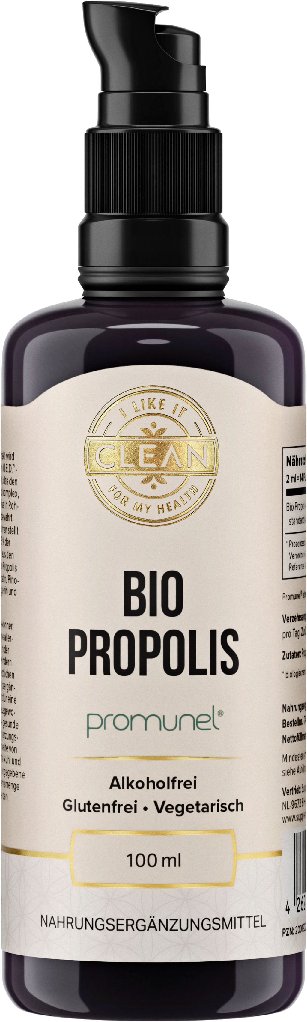 Ontdek het biologische propolisextract van i like it clean - een alcoholvrije, gereduceerde formule met slechts twee ingrediënten: gestandaardiseerd propolisextract (Promunel™) en biologische glycerine uit lijnzaad. Afgevuld in hoogwaardig MIRON ultraviolet glas en met een pipet van BPA-vrij, weekmakervrij plastic, biedt dit product een geraffineerde combinatie van kwaliteit en zuiverheid.