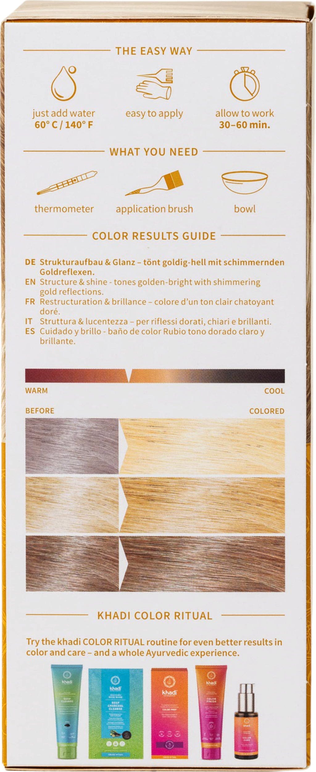 • Khadi Golden Hint is perfect als voorbehandeling op licht en blond haar bij het gebruik van de lichtblonde, mediumblonde en lichtbruine kleurstoffen.
