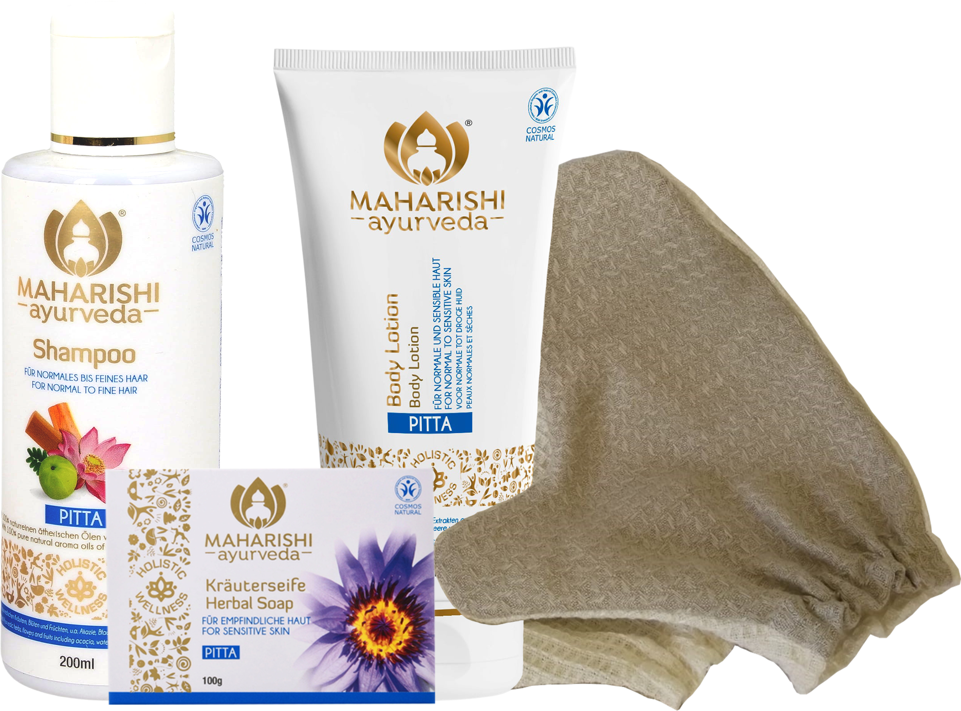 et deze ayurvedische basisset voor lichaamsverzorging kunnen Pitta-constitutietypes ontspannen ademhalen. Met slechts één klik haal je alle onmisbare verzorgingsproducten gemakkelijk in huis. Geen lang zoeken, geen uitgebreide research en geen onzekerheid. De ayurvedische lichaamsverzorgings-basisset Pitta is compleet samengesteld en sluit perfect aan bij de behoeften van gevoelige Pitta-types.