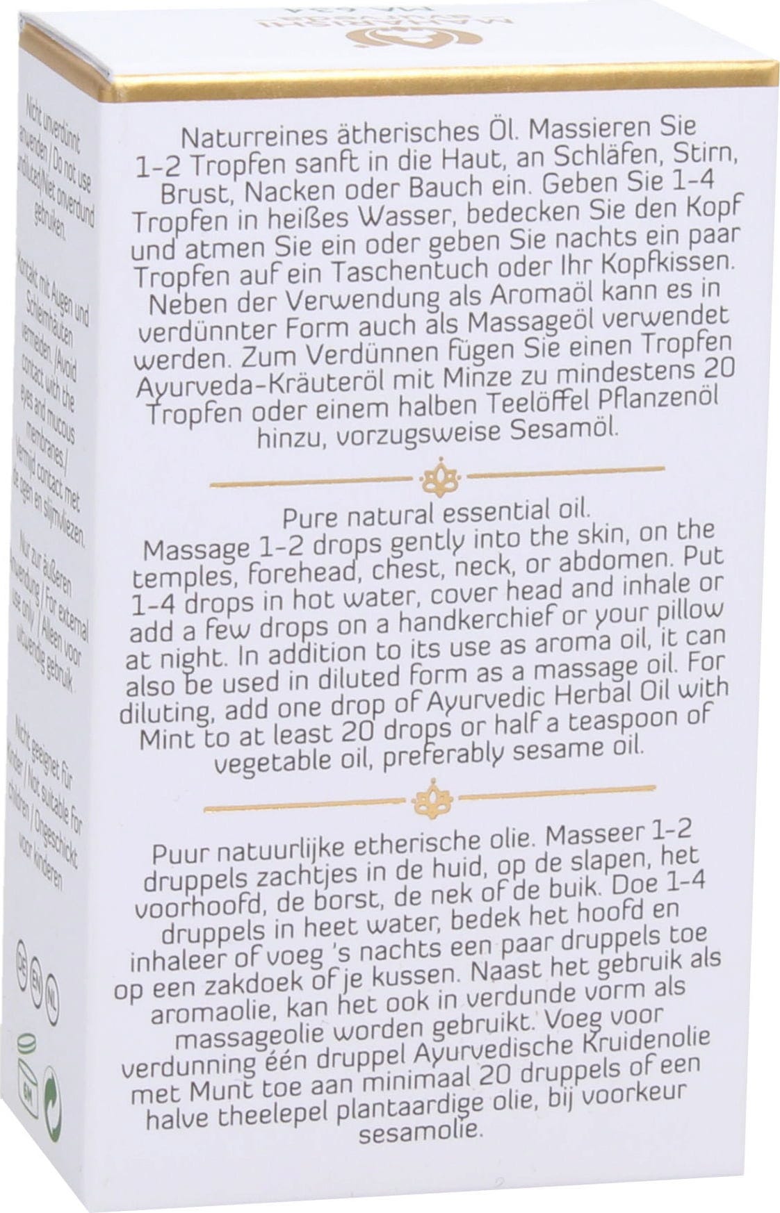 Natuurlijke plantaardige olie. Naast het gebruik als aromatische olie, kan het ook worden verdund en zachtjes worden gemasseerd op de slapen, borst, nek of buik. Voeg voor verdunning één druppel Ayurvedische Kruidenolie met Munt toe aan minstens 20 druppels of een halve theelepel plantaardige olie, bij voorkeur sesamolie.
