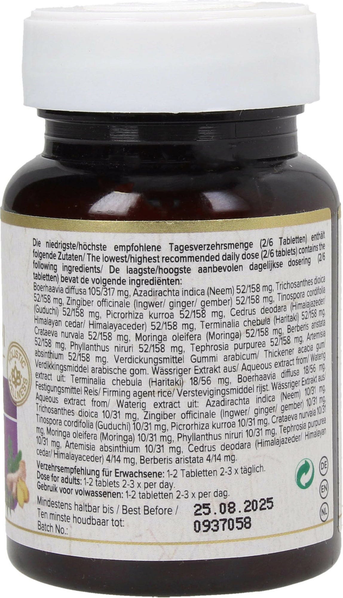 79 % Kruiden (Boerhaavia diffusa, neem (Azadirachta indica), Trichantes dioica, gember, Guduchi (Tinospora cordifolia), Katuka, Himalaya ceder, myrobalan fruitpoeder, Crataeva nurvala, moringaboom, berberisbessen, chanca piedra (bhumyamalaki, phyllanthus niruri), Tephrosia purpurea, Wermutkraut), 15 % kruidenextracten (Boerhaavia diffusa, myrobalan fruitpoeder, neem (Azadirachta indica), Trichantes dioica, gember, Guduchi (Tinospora cordifolia), Katuka, Crataeva nurvala, moringaboom, chanca piedra (bhumyamalaki, phyllanthus niruri), Tephrosia purpurea, Wermutkraut, Himalaya ceder, berberisbessen), Gummi Arabicum[1], Talkum[2], Magnesiumsalze von Speisefettsäuren