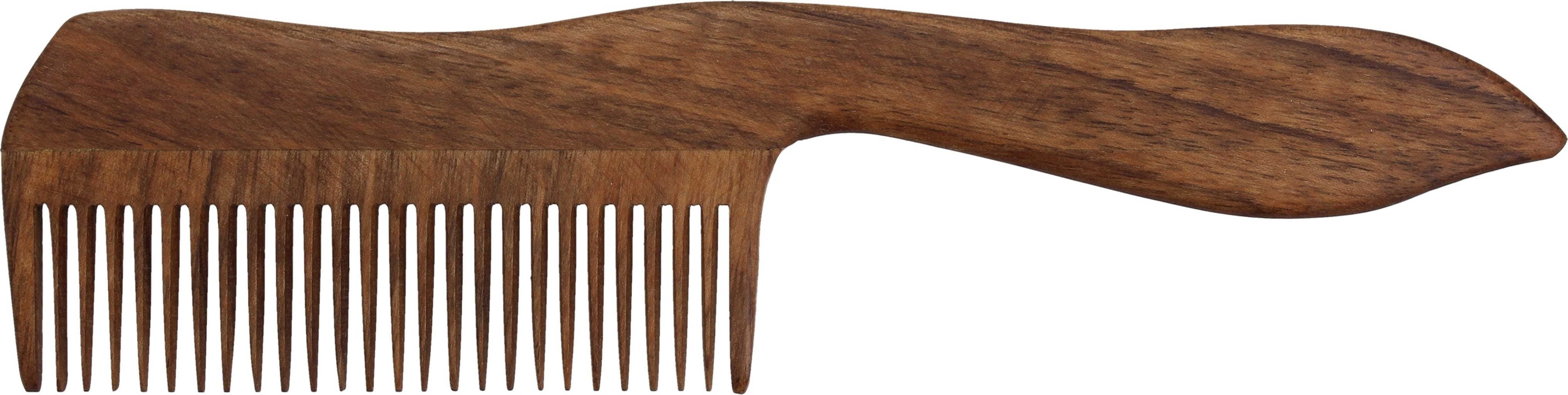 De houten kam heeft dichte tanden en is verkrijgbaar in een afwerking van walnoot of kersenhout.