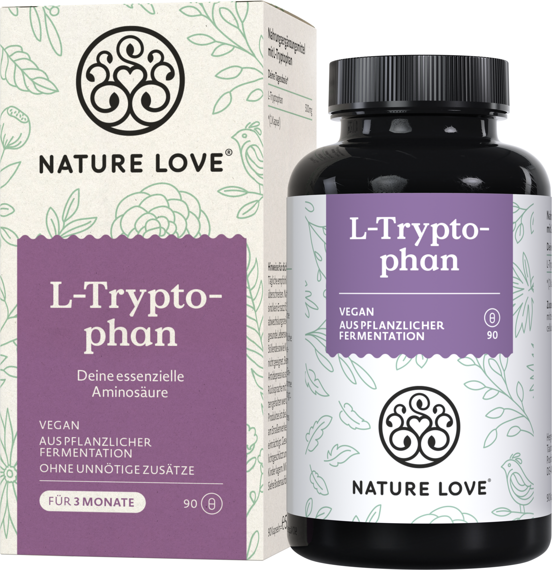 L-tryptofaan is een van de essentiële aminozuren en kan niet door ons lichaam zelf worden aangemaakt. Nature Love's L-Tryptofaan wordt verkregen uit plantenfermentatie en wordt volledig geproduceerd zonder ongewenste toevoegingen.