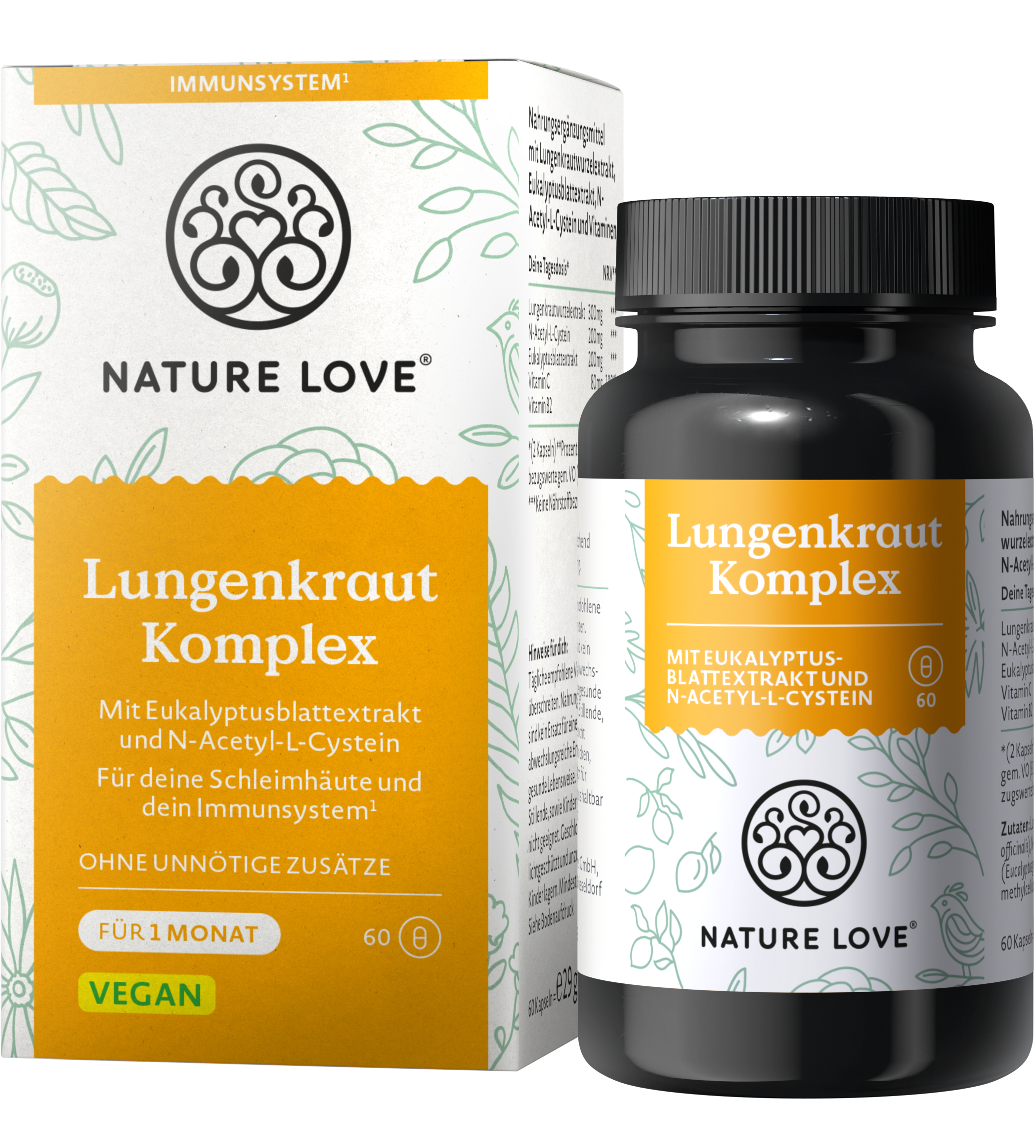 Nature Love gebruikt voor het longkruidcomplex hoogwaardige extracten van longkruidwortel en eucalyptusbladeren. De capsules zijn ook verrijkt met vitamine C, NAC (N-acetyl-L-cysteïne) en riboflavine voor de best mogelijke holistische ondersteuning van je lichaam. De capsules zijn volledig vegan en vrij van gluten en onnodige toevoegingen.