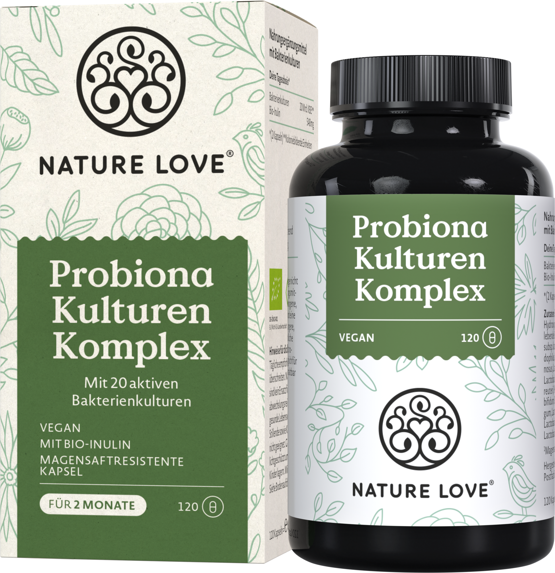 De Probiona Culturen Complex-capsules van Nature Love bieden 20 verschillende bacterieculturen en 20 miljard kolonievormende eenheden (CFU) bij de aanbevolen dagelijkse dosis. Daarnaast levert het product inuline, afkomstig uit de biologische landbouw.