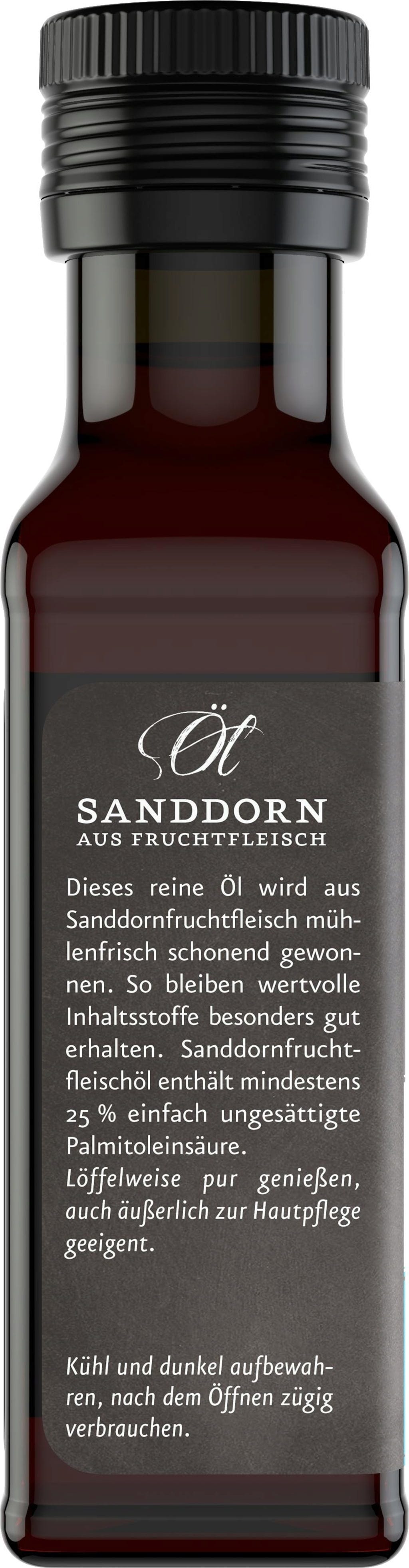 De biologische duindoornpulpolie wordt niet verkregen uit de pitten van de vrucht, maar uit het vruchtvlees van de feloranje duindoornbessen. De duindoornvrucht wordt geteeld aan struiken op biologische boerderijen in Duitsland. De waardevolle bestanddelen, de sterke, fruitige smaak en de heldere kleur van de bessen blijven behouden in de koudgeperste olie.