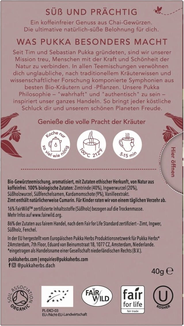 | Verantwoordelijk voedingsbedrijf: | Lipton Teas and Infusions Germany GmbH, Axel-Springer-Platz 3, c/o WeWork, 20355, Hamburg, Duitsland, kontakt@pukkaherbs.de |