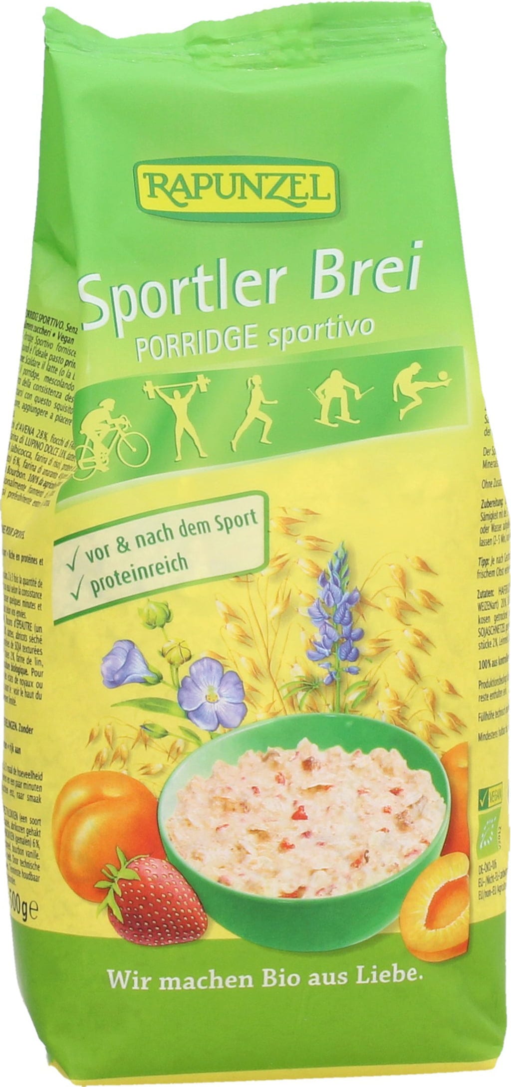 De naam zegt het al: de Biologische Sport Porridge van Rapunzel is voor alle actieve mensen die mueslis waarderen met een uitgebalanceerde combinatie van hoogwaardige koolhydraten, eiwitten en suiker. Waardevolle granen en peulvruchteiwitten van zoete lupine, soja en amarant smaken ook echt heerlijk en laten individuele mixen met zuivelproducten of melkalternatieven, vers fruit en jouw favoriete noot toe - de juiste basis voor gevarieerde maaltijden.
