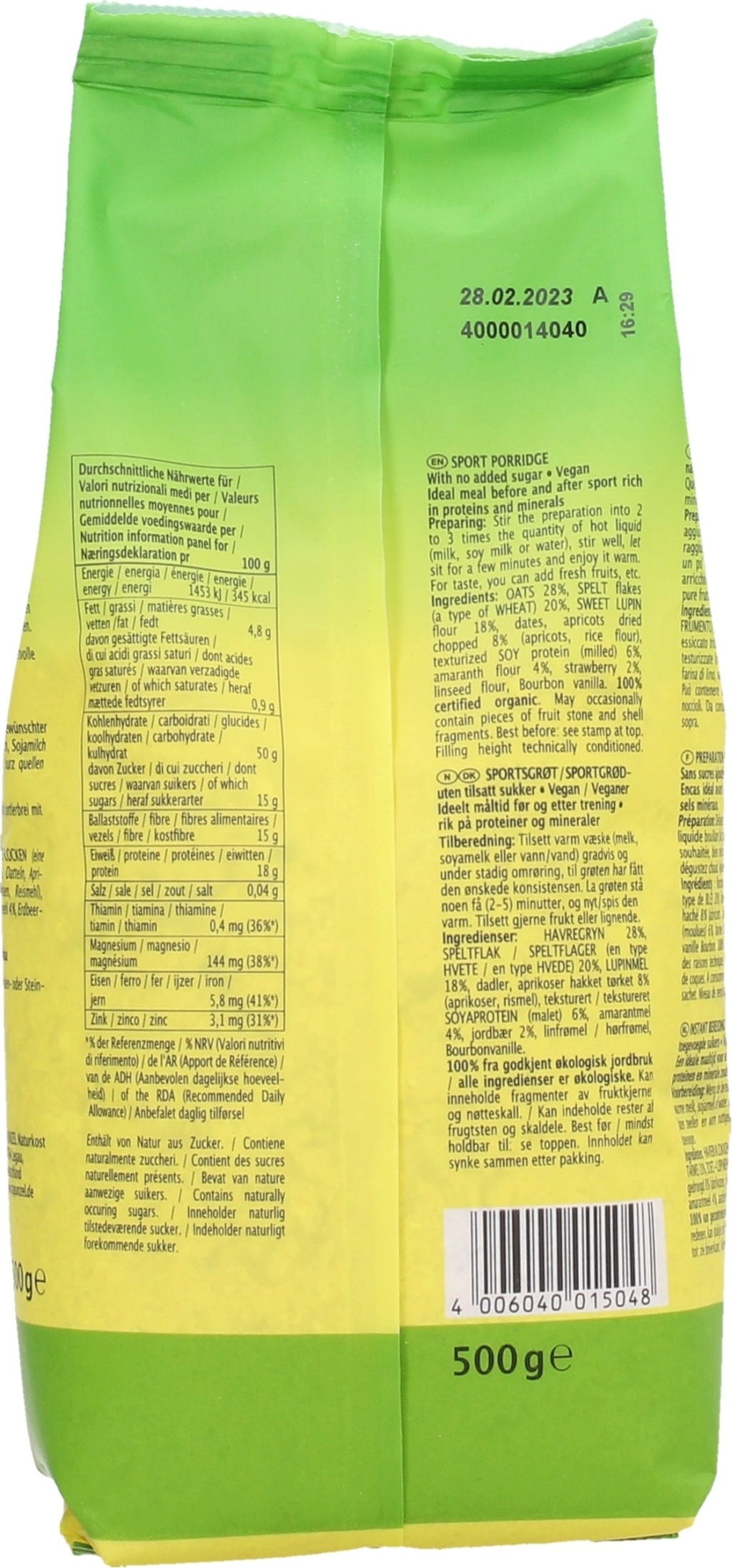 28 % havervlokken[1], 20 % speltvlokken[1], 18 % zoete lupinemeel[1], dadels[1], abrikozen (gedroogd gehakt) 8,00%[1] (abrikozen[1], Rijstmeel[1]), 6 % soja reepjes (gemalen)[1], 4 % amarantmeel[1], 2 % aardbeien[1], lijnzaadmeel[1], bourbon vanille[1]