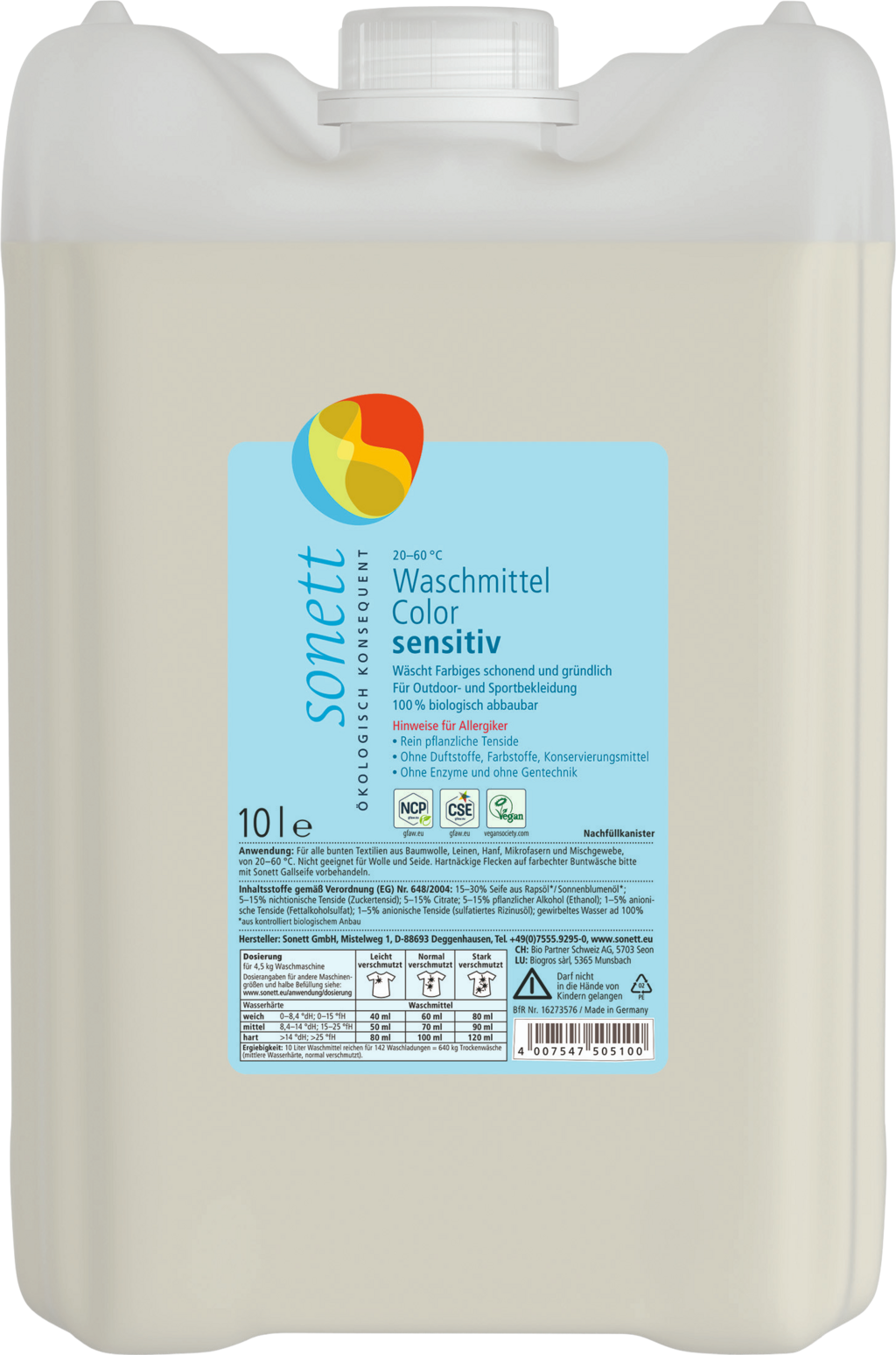 Het Vloeibaar Wasmiddel Color Sensitive van Sonett bevat geen geurstoffen, kleurstoffen of conserveringsmiddelen en is daarom bijzonder geschikt voor mensen met een allergie of een gevoelige huid. De wasformule ontleent zijn kracht aan zeep, suikersurfactanten en vetalcoholsulfaat en is geschikt voor alle wasbaar gekleurd textiel van katoen, linnen, hennep, microvezels zoals fleece, softshell, Goretex en gemengde stoffen. Het wasmiddel werkt het beste bij wastemperaturen van 20-60 °C. Een speciaal pluspunt: de formule is vegan en 100% biologisch afbreekbaar!