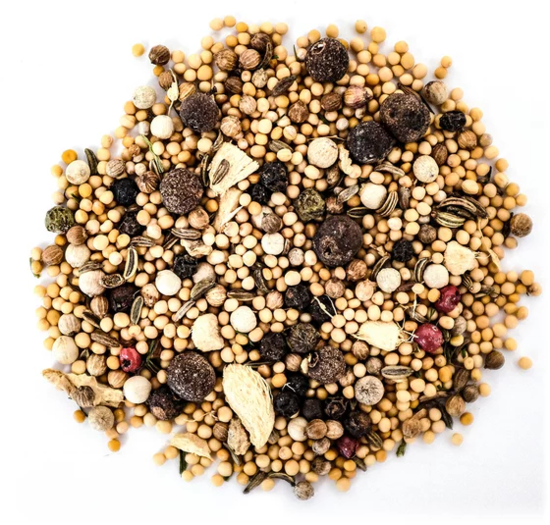 68 % mosterdzaadjes geel[1], 6 % stukjes gember[1], koriander[1], Spaanse peper[1], zwarte peper[1], venkel[1], witte peper[1], 2 % dille[1], 1 % roze peper[1], 1 % groene peper[1]