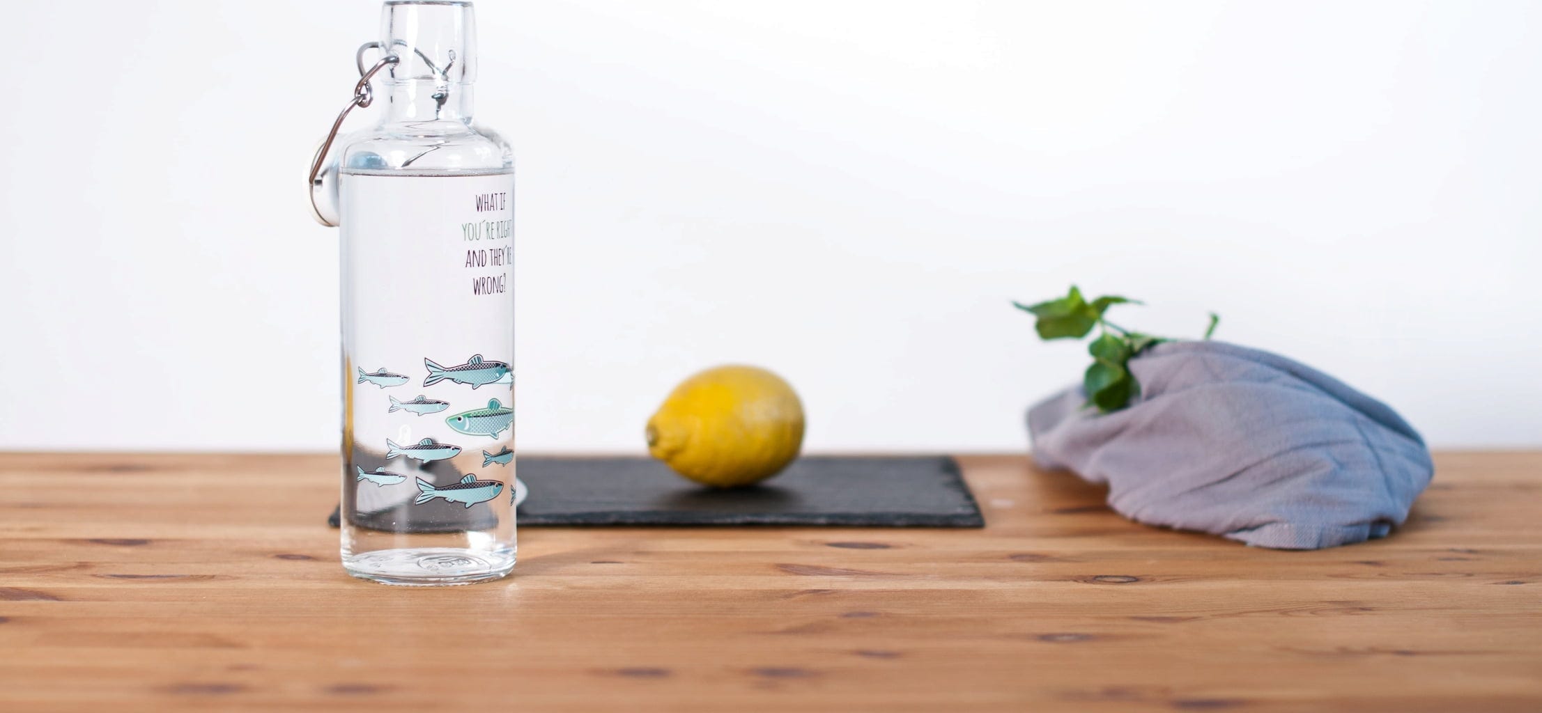 Met deze glazen fles is plasticvrij drinkplezier gegarandeerd. Hoogwaardige materialen beschermen het milieu, terwijl het geweldige ontwerp zwemmen tegen de stroom in stimuleert en frisse ideeën bevordert. Ideaal niet alleen voor individualisten.