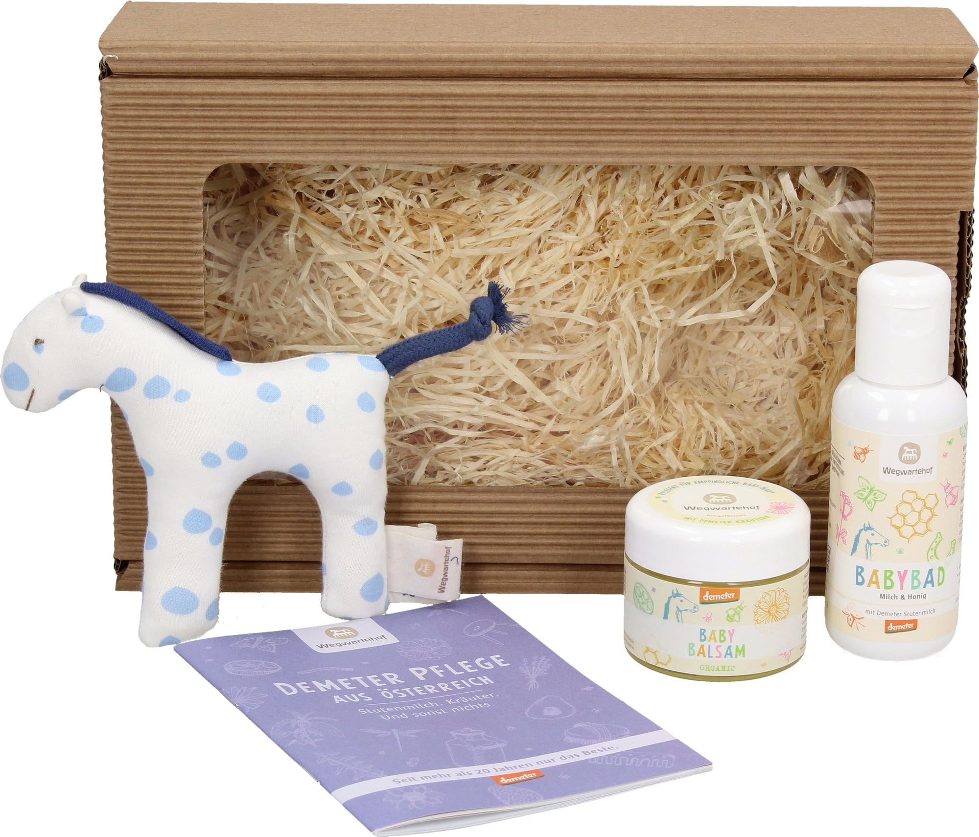 Deze set is een geweldig cadeau voor baby's en peuters. De babybalsem verzorgt de tere babyhuid met rijke ingrediënten en is bijzonder zacht. Het pakket bevat ook het babybadje met melk en honing als perfecte aanvulling. Er is ook een stoffen paard gemaakt van Demeter-katoen.