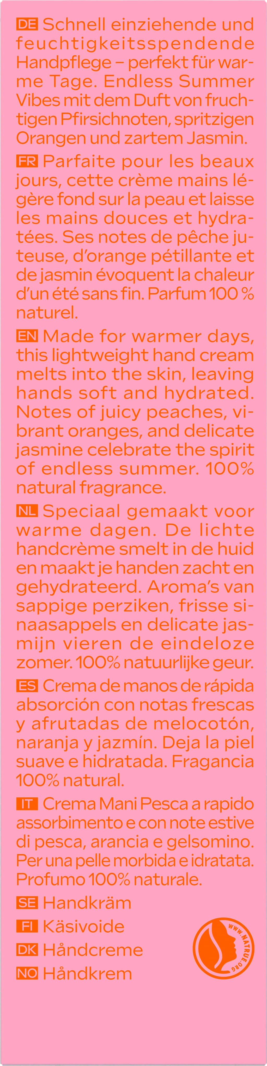 De Pink Peach Hand Cream biedt snel absorberende en hydraterende handverzorging. Dit maakt het perfect voor warme dagen. De heerlijke geur van fruitige perzik, pittige sinaasappel en jasmijn zorgt echter voor het absolute zomergevoel. Een handcrème als op een warme zomerdag!