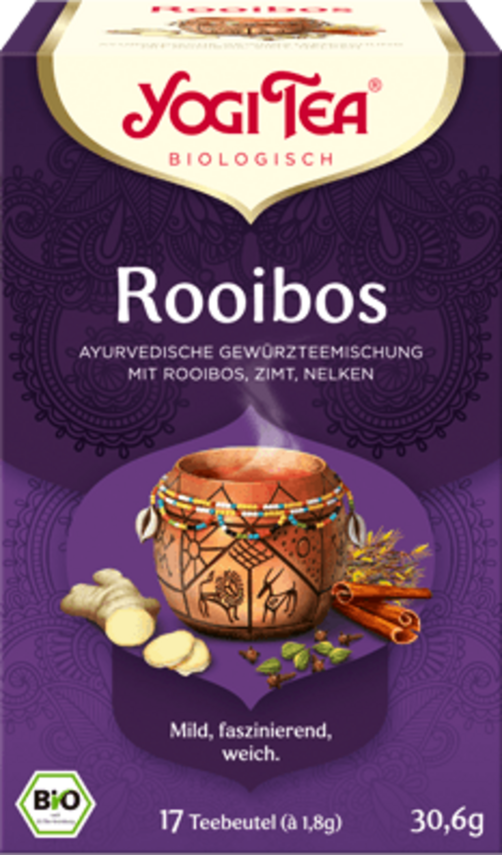Zoet, warm en zonnig, rooibosthee straalt rijke Afrikaanse folklore uit. De toevoeging van traditionele YOGI TEA®-kruiden, zoals kaneel, gember, kardemom, kruidnagel en een vleugje zwarte peper, brengt het milde, aardse aroma van rooibos tot leven, terwijl johannesbrood en vanille deze zoete, vriendelijke thee afmaken.
